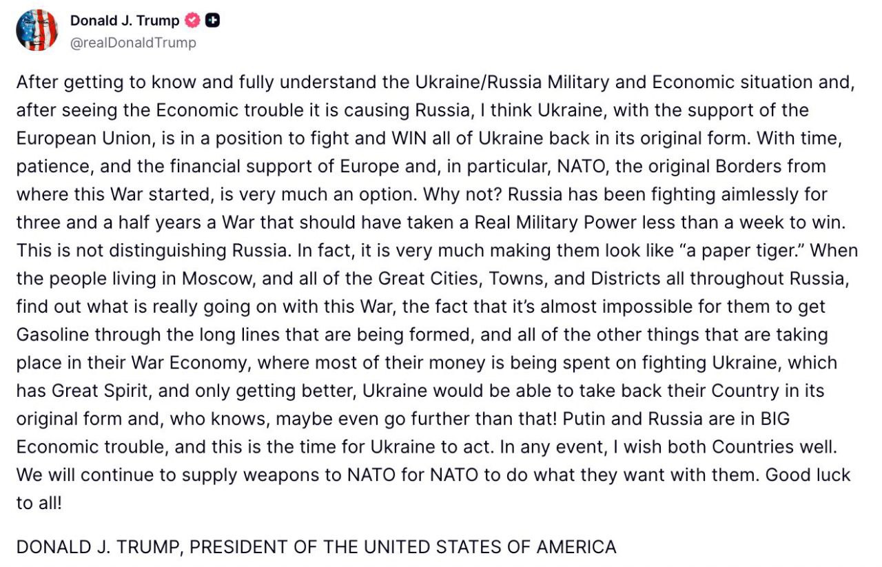 特朗普23日下午还发帖,一转他此前在结束俄乌战争上的保守立场,认为俄经济虚弱,乌克兰可在欧盟和北约的武器与金融援助下夺回战前领土(他并未说明是2022还是2014年实控边界),甚至推进得更远。他还嘲讽俄将本应在一周内结束的战争打成三年半,让俄看起来像“纸老虎”;民众如今因战争而汽油短缺。美国将继续向北约提供武器。