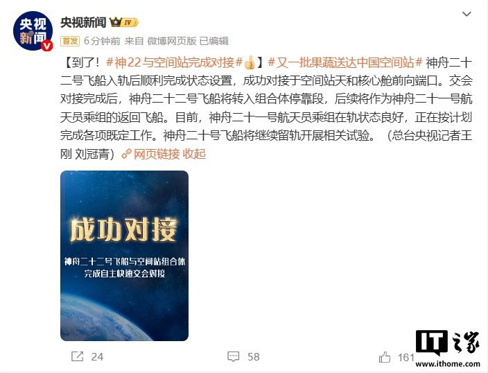 神舟二十二号飞船于北京时间2025年11月25日成功发射,并于入轨后顺利完成状态设置,与空间站天和核心舱前向端口对接。飞船搭载长征二号F遥二十二运载火箭,发射任务取得圆满成功。神舟二十二号将转入组合体停靠段,后续作为神舟二十一号航天员乘组的返回飞船。飞船为无人状态,装载航天食品、药品、新鲜果蔬等,以及备品备件。此次任务为中国载人航天工程第38次发射,也是首次应急发射任务。IT之家